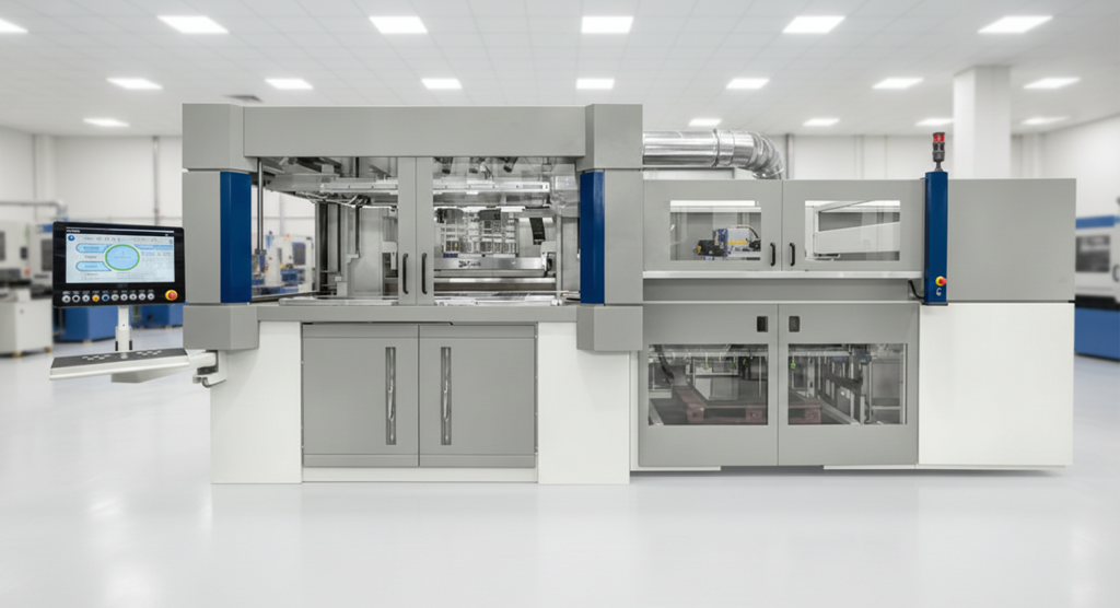 Thermoforming sistemlerimiz, hassas sıcaklık kontrollü ısıtıcılar, hızlı şekillendirme istasyonları ve CNC trimming üniteleri içerir. Tek ve çift istasyonlu makinelerden tam otomatik inline sistemlere kadar çözümler sunuyoruz. ABS, PMMA, PC, PETG ve diğer termoplastikler için optimize edilmiş ısıtma profilleri ve şekillendirme parametreleri geliştirilir. Kalıp tasarım desteği, prototip üretimi ve seri üretime geçiş süreçlerinde teknik danışmanlık veriyoruz. Otomotiv iç trim parçaları, medikal kapaklar, endüstriyel muhafazalar için referans projelerimiz mevcuttur.